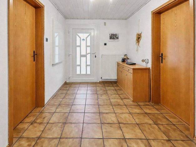 Hauseingang in einen vorgebauten Windfang (1995) Diele mit Treppenhaus. Links separater Bereich (ggf. Einliegerwohnung) mit Flur, Duschbad, kleiner Küche und 2 Zimmern. Vor Kopf Flur, Keller, Tankrau...