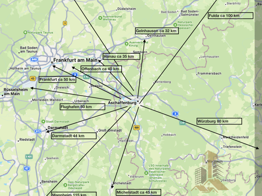 Aschaffenburg liegt malerisch am Main, etwa 40 Kilometer östlich von Frankfurt am Main. Die Stadt ist hervorragend an das Verkehrsnetz angebunden: Die Autobahnen A3 und A45 bieten schnelle Verbindungen nach Frankfurt, Würzburg und in das gesamte Rhein-Main-Gebiet. Mit der Bahn bist du in ca. 30 Minuten in Frankfurt – ideal für Berufspendler.