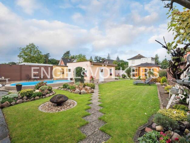Dieses charmante Einfamilienhaus verbindet modernen Wohnkomfort mit dem Flair einer gewachsenen Umgebung. Hier genießt man entspannte Stunden im großzügigen Garten mit eigenem Salzwasser-Pool, Pavill...