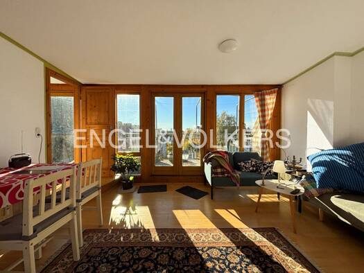 Von dem Eingangsbereich mit Garderobe gelangen Sie in die Diele. Dort fällt der Blick auf den gut erhaltenen Terrazzo - Steinboden, die Treppe mit dem schnörkeligen Treppengeländer und auf die hohen,...