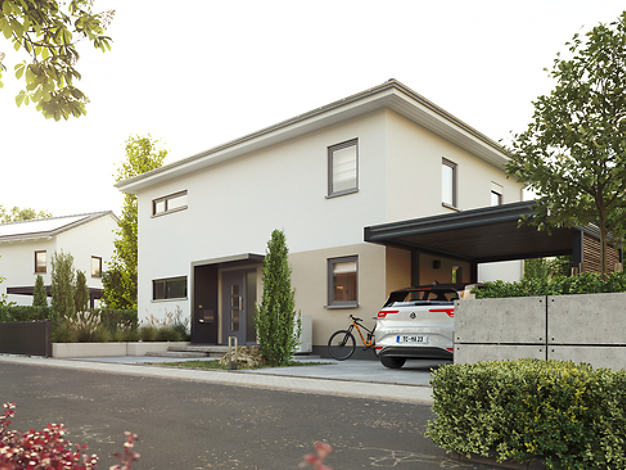 Dieser Bungalow besticht durch sein modernes Design und innovative Architektur, die einen hohen Wohnkomfort gewährleisten. Besonders ins Auge fallen die Rücksprünge an der Fassade, die dem Gebäude ei...