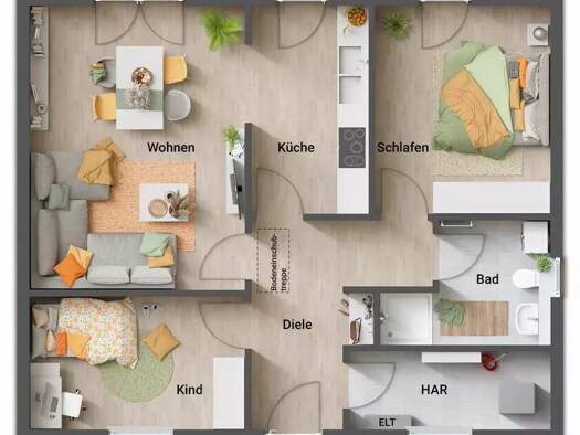 Objektbeschreibung Familienleben auf einer Ebene - Der Bungalow 131 hat es in sich – Die Baunebenkosten und das Grundstück sind in diesem Exposé NICHT enthalten. Raumaufteilung 5 Zimmer, zwei Kinderz...
