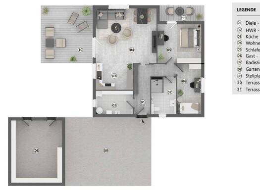 Unser Bungalow 1 Walmdach bietet auf einer Wohnfläche von 107 m² alles, was die Kleinfamilie zum Wohnen und Wohlfühlen benötigt. Das kombinierte Wohn-Ess-Zimmer ist großzügig geschnitten und dank dre...
