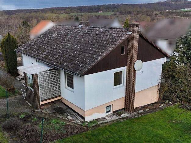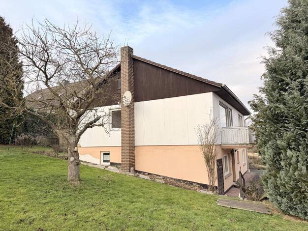 Dieser freistehende Bungalow wurde von der Firma Zenker in Holzrahmenbauweise mit einem Vollgeschoss, einem massiv erstellten Kellergeschoss und einem Satteldach ca. im Jahre 1971 errichtet. Der Auss...