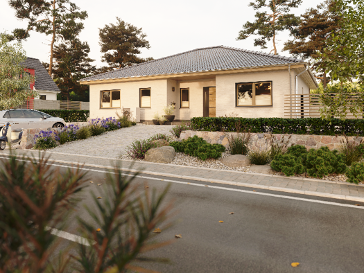 Unser Bungalow 1 Walmdach bietet auf einer Wohnfläche von 107 m² alles, was die Kleinfamilie zum Wohnen und Wohlfühlen benötigt. Das kombinierte Wohn-Ess-Zimmer ist großzügig geschnitten und dank dre...