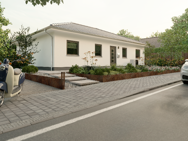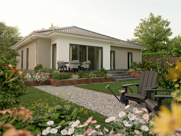 Unser Bungalow 1 Walmdach bietet auf einer Wohnfläche von 107 m² alles, was die Kleinfamilie zum Wohnen und Wohlfühlen benötigt. Das kombinierte Wohn-Ess-Zimmer ist großzügig geschnitten und dank dre...