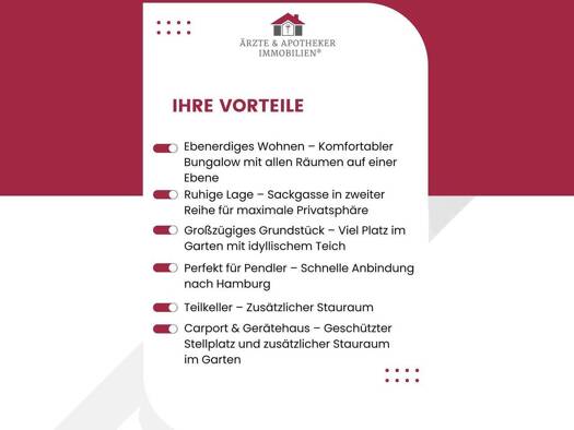 Die Immobilie verbindet die Vorzüge eines traumhaften Grundstücks in einer gepflegten Nachbarschaft mit dem großzügigen und ebenerdigen Wohnkomfort des Bungalows. Durch die L-Form des Gebäudes entste...