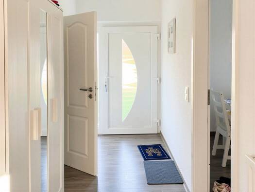 Von der Terrasse aus betritt man durch die Eingangstür einen kleinen Windfang, der angenehm hell und einladend wirkt. Hier sind noch die rechteckigen, braunen Bodenfliesen zu sehen, die im klassische...