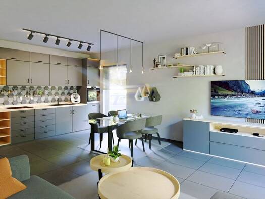 Dieser Bungalow bietet eine ideale Lösung für komfortables Wohnen auf kleinem Raum. Mit einer Fläche von rund 72 m² kombiniert er Funktionalität und Stil. Im offenen Wohn-Ess-Koch-Bereich fließen Küc...