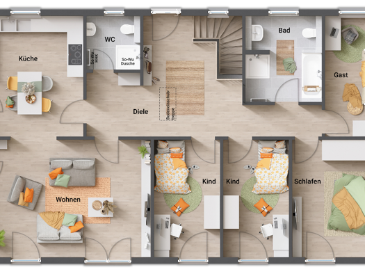 - 130?m² Wohnfläche auf einer Ebene - Offene Wohnküche als zentraler Familientreffpunkt - Großes Wohnzimmer mit Zugang zur Terrasse - 2 Kinderzimmer, 1 Elternschlafzimmer, 1 Gäste-/Arbeitszimmer - Ha...