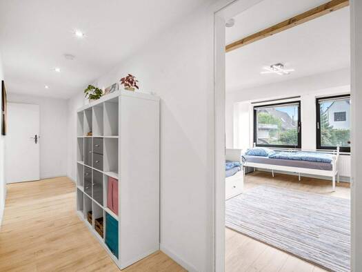 Über einen separaten Hauseingangsbereich mit ausreichend Platz für eine Garderobe wird der ausladende Flur des Hauses samt angrenzendem Essbereich erreicht. Bei geöffneter Schiebetür zum danebenliege...