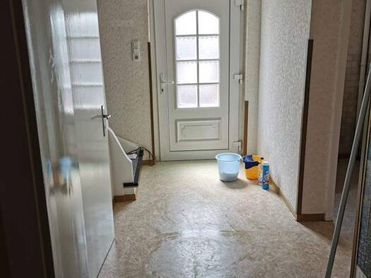 Im Erdgeschoss befindet sich die ehemalige Küche ,das Wohn- und Esszimmer und ein Bad . Zwei Zimmer , ein Bad , eine Küche und der Wintergarten sind im Obergeschoss untergebracht . Ein zusätzliches Z...
