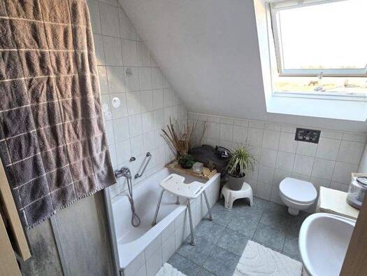 Doppelhaushälfte in Hanglage mit einem Geschoss und Keller, ausgebautem Dachgeschoss, mit einer Wohnfläche von 101 m² und einer Nutzfläche von 47 m². Die Immobilie verfügt über eine Garage mit 30 m² ...