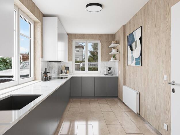 Diese hochwertige Doppelhaushälfte begrüßt Sie mit einem komfortablen Flurbereich, von dem ein Gäste-WC mit Dusche sowie die Küche mit Marquard-Einbauküche und rechts der großzügige offene Wohn- Essb...