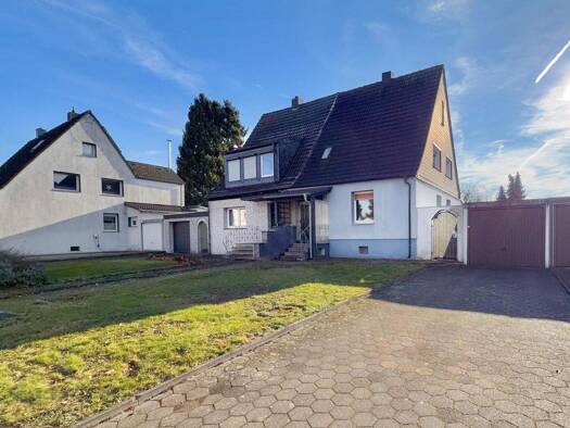 Doppelhaushälfte mit zwei Etagen, Keller und einer Wohnfläche von 94 m², nebst Garage und Carport, Baujahr 1968. Die Raumaufteilung ist wie folgt: Im Keller befinden sich ein Flur, ein Duschbad, ein ...