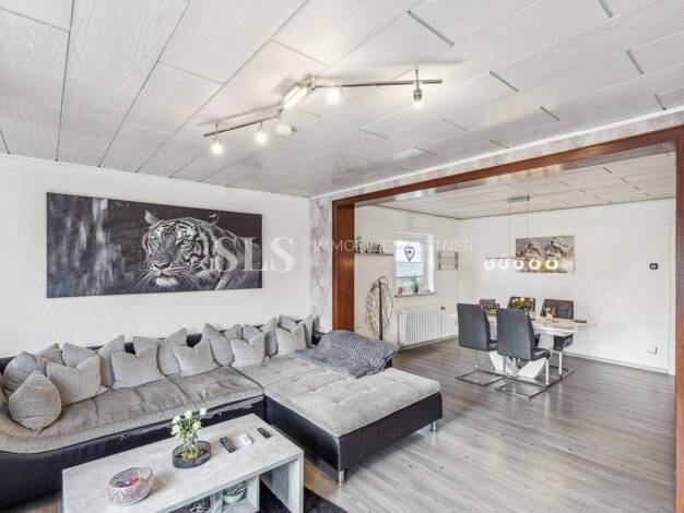 Im Erdgeschoss finden Sie ein großzügiges Wohnzimmer mit Essbereich sowie die Küche und ein Gäste-WC. Das Dachgeschoss bietet Platz für drei Schlafzimmer und ein Bad. Das Haus beeindruckt durch die s...