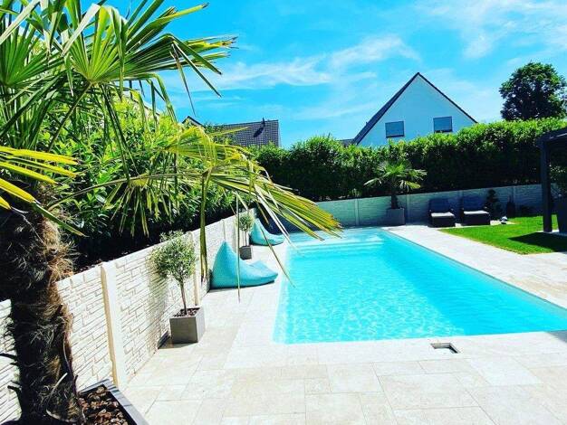 Diese außergewöhnliche mediterrane und hochwertige Doppelhaushälfte bietet luxuriösen Wohnkomfort und ein ganzjähriges Urlaubsambiente. Highlight ist der ca. 8×4 m große, beheizte Pool (Wärmepumpe + ...