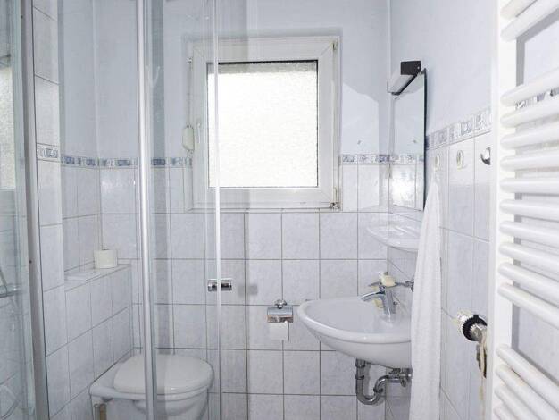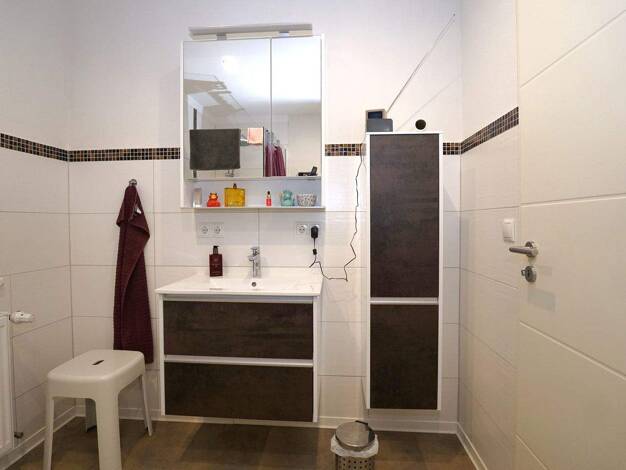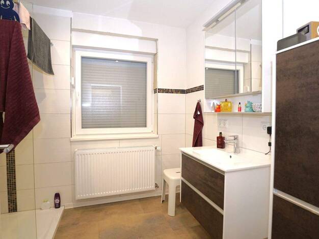 **Erdgeschoss:** Willkommen im Erdgeschoss dieser charmanten Immobilie. Direkt im Eingangsbereich erwartet Sie links ein modernisiertes, bodengleiches Tageslicht-Duschbad, das 2022 mit hochwertigen M...
