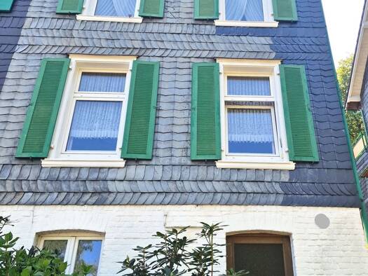 BESONDERHEIT Diese Doppelhaushälfte nähe dem Skulpturenpark Waldfrieden weckt bereits äußerlich mit Schieferfront, bergisch-grünen Schlagläden und grüner Rückseite den Wunsch, hier ein Zuhause zu fin...