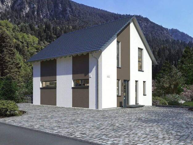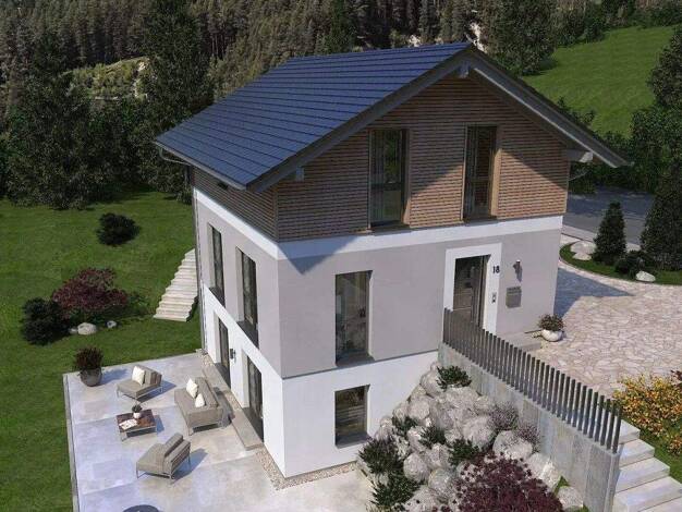 Wer viel Wert auf Optik und eine optimale Raumausnutzung legt, ist hier genau richtig. Bodentiefe Fenster, jeweils eine Gaube im Eingangs- und über dem Terrassenbereich und ein Drempel von 1,75 m erz...