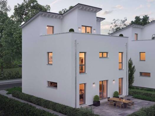 Objektbeschreibung Das „Aura 125“ überzeugt mit seiner cleveren Bauweise und flexiblen Gestaltungsmöglichkeiten. Dank seiner kompakten Außenmaße findet dieses Haus gerade auf kleinen und schmalen Gru...