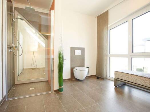Schon von außen ist die Stadtvilla 14 ein echter Hingucker. Geradlinig und durchdacht präsentiert sich der rund 144 Quadratmeter große Innenbereich: Direkt an das geräumige Wohn-Esszimmer mit Küche s...
