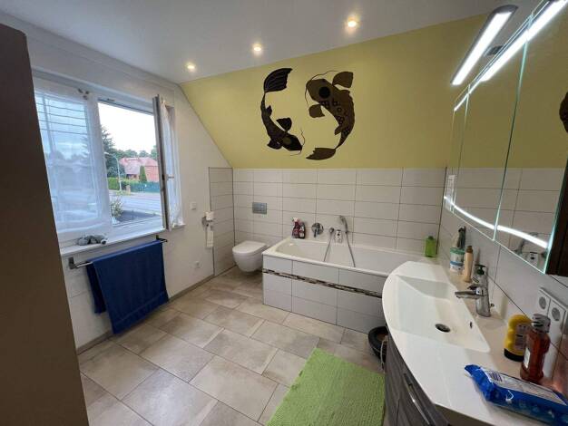 Freistehendes Einfamilienhaus, 1-stöckig mit Keller und ausgebautem Dachgeschoss, 157 Quadratmeter Wohnfläche, mit Gartenteich, Baujahr 1937 Der Zustand des Baus und der Instandhaltung ist noch akzep...
