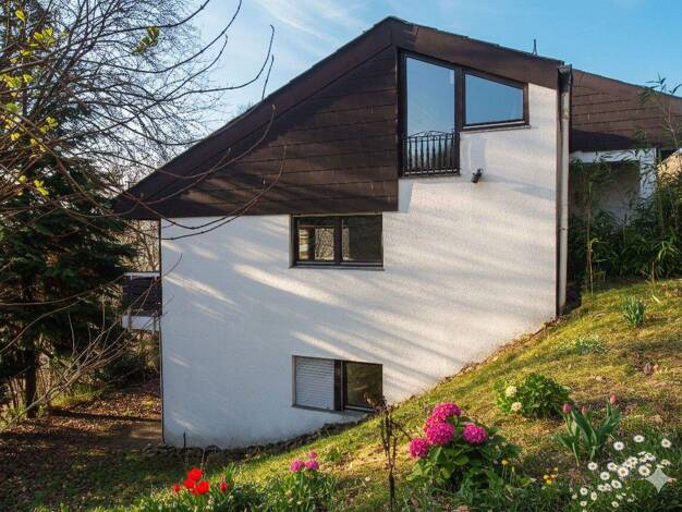 Dieses im Jahr 1970 erbaute Architektenhaus ist ein echtes Unikat für Individualisten. Das Gebäude wurde in massiver Bauweise stufenförmig in den Hang gebaut, was eine spannende Split-Level-Architekt...