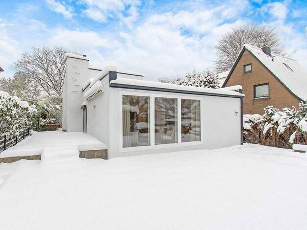 Architektenhaus, Flachdach, saniert in 2015, Teilkeller, Holzfenster isolierverglast, direkt angrenzend zum Naturschutzgebiet Eppendorfer Moor, Blick ins Grüne, Garten vor und hinter dem Haus, Heizun...