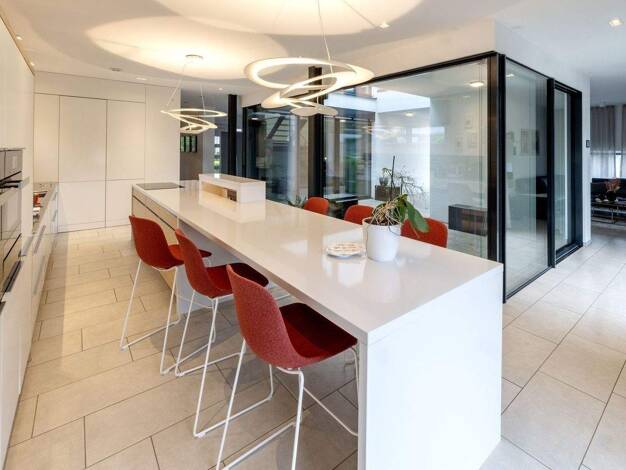 Ausgezeichnet mit dem German Design Award, steht das "Musterhaus Bad Vilbel" für inspirierende Architektur, optimale Grundstücksnutzung und ein Höchstmaß an Energieeffizienz. An das großzügige Hauptg...