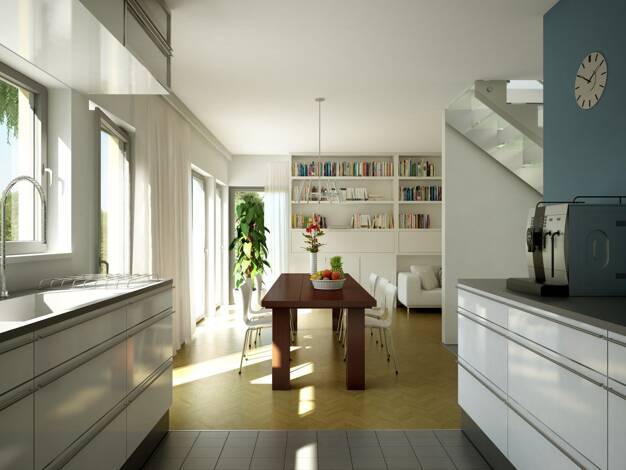 Das Mitwachshaus Flair 148 hat alles, was ein Haus zum Wohlfühlen benötigt: ein gemütliches Wohnzimmer mit hellem Essbereich und großen Fenstern, die viel Tageslicht hinein lassen. Die geräumige Küch...