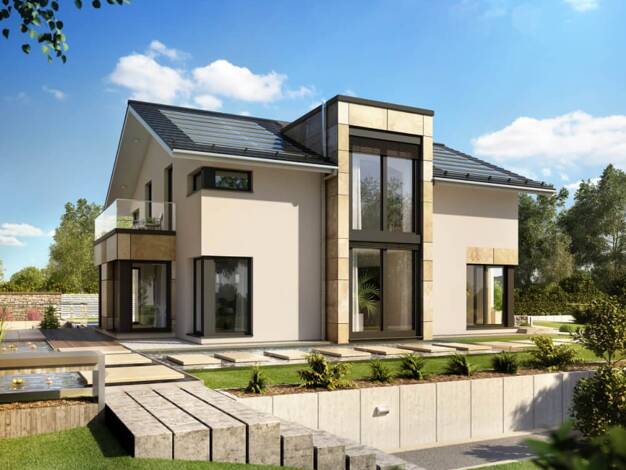 Das Massivhaus Trend ist modern und zeitlos zugleich. Die Architektursprache des Familienhauses ist klassisch, kombiniert mit der modernen Grundrissgestaltung im Innenraum. Das Erdgeschoss folgt dem ...