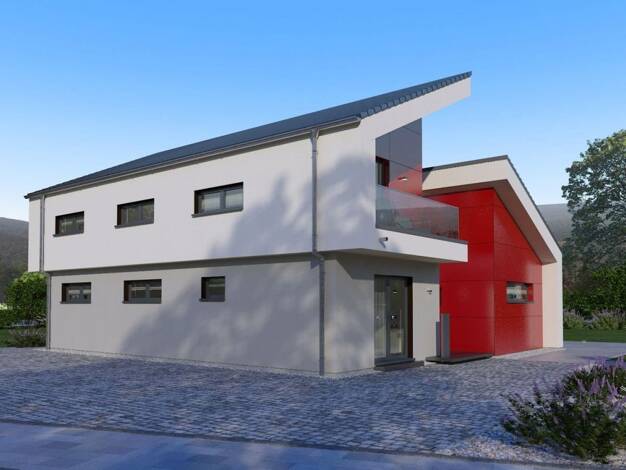 Bei unserem Musterhaus Simmern trifft eine außergewöhnliche Fassadengestaltung auf ein Wohnerlebnis der besonderen Art. Die Außengestaltung wird geprägt durch das versetzte Pultdach und den Rückversa...