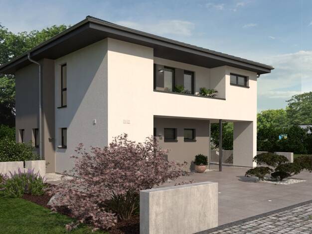 Die geradlinige Struktur der zweigeschossigen Flachdachvilla wird durch die Fassadenrücksprünge und die asymmetrische Gestaltung architektonisch ergänzt. Clever und vor allem für kleine Grundstücke g...