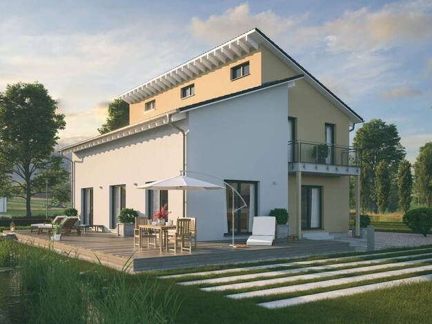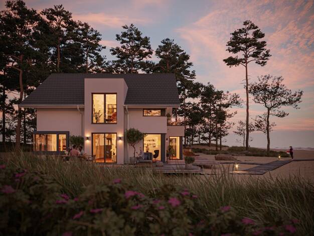 Puristisches Raumwunder auch für kompaktere Grundstücke: Unser Trendhaus hat zwei Wohnebenen mit einer Nettogrundfläche von insgesamt 112 m2. Extrahohe Decken und mehrere bodentiefe Fenster sorgen fü...