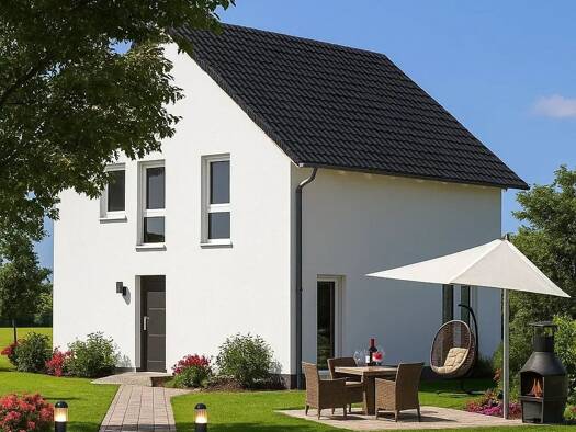 Modernes projektiertes Fertighaus mit ca. 135 m² Wohnfläche 5 Zimmer auf zwei optimal geplanten Etagen Perfekte Kombination aus Wohnen, Arbeiten & Familienleben Offener, heller Wohnbereich im Erd...