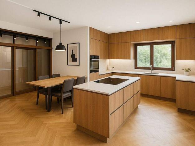 Im Erdgeschoss dieses Einfamilienhauses empfängt Sie ein großzügiges und offenes Wohnzimmer, das nahtlos ins Esszimmer und anschließend in die Küche übergeht. Diese lichtdurchflutete Raumgestaltung s...