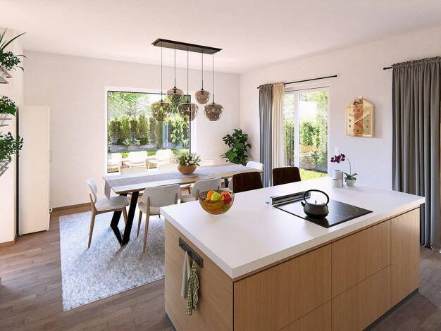 Architektenentwurf: Pure 4 Objektbeschreibung ----------------------------- Das Herz dieses Hauses schlägt im offenen Küchen-, Wohn- und Essbereich, in dem Kochen, Genießen und Wohnen fließend ineina...