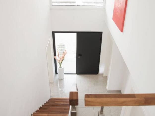 Bereits der Eingangsbereich mit seinen großen Fensterflächen und der Galerie offenbart das helle und besondere Ambiente des ganzen Hauses. Eine zweiflügelige Glastür verbindet die Diele mit dem großz...