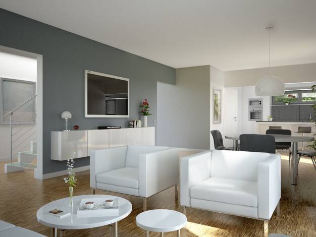 Hier trifft modernes Design auf clevere Raumaufteilung. Unser HOME 1 bietet mit 125,30 m² großzügige Wohnbereiche, eine offene Küche und praktische Stauraumlösungen. Im Obergeschoss sorgen gut geschn...