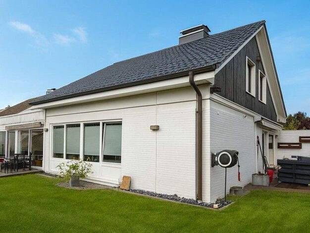 Schlichte Eleganz und ein durchdachtes Raumkonzept verleihen diesem Einfamilienhaus seine besondere Ausstrahlung. Die klare Linienführung der Architektur wird von einer zweifarbigen Fassadengestaltun...