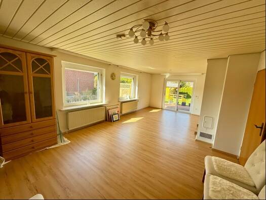 Dieser Walmdach-Bungalow ist im Jahr 1978 erbaut worden und verfügt über eine große Wohnstube mit Ess-Diele, vier weitere Zimmer, offenen Kamin, Hauswirtschaftsraum mit eigenem Eingang und einen komp...