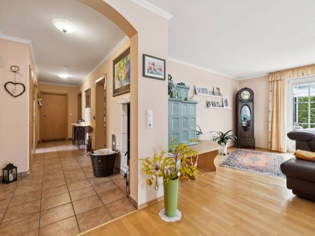 Wohnen mit hoher Lebensqualität! Diese elegante und funktional ausgestattete Immobilie liegt am Ende einer Sackgasse. Sie hat eine großzügige Raumaufteilung auf über 200 m² mit hohen Decken, bodentie...