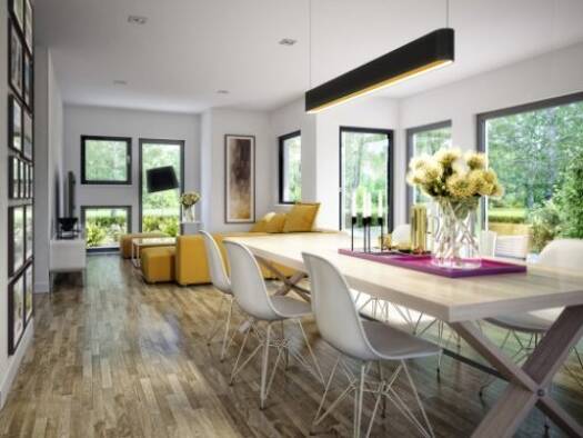 Unser Einfamilienhaus EVOLUTION 122 WD V8 bietet durch die zahlreichen, bodentiefen Fensterelemente im Erdgeschoss nicht nur lichtdurchflutete Räumlichkeiten, sondern dadurch auch ein einmaliges Wohn...