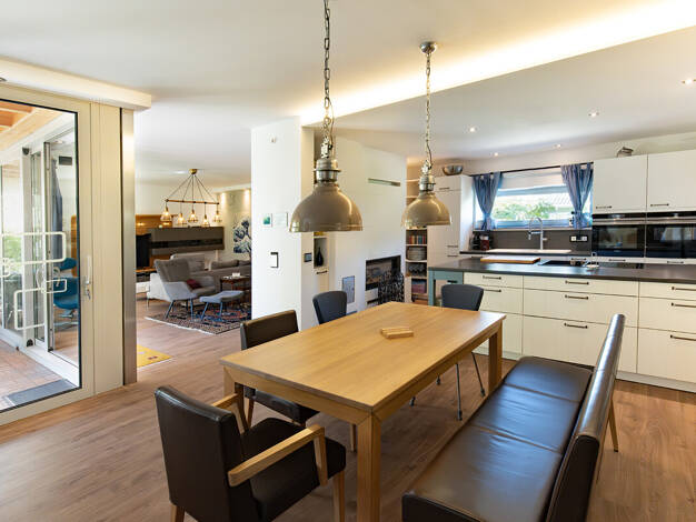 Das großzügige Einfamilienhaus besticht durch die modernen, großflächigen Fenster, die viel Licht ins Innere lassen und zum Verweilen mit Familie und Freunden einladen. Wohnen, Essen und Kochen bilde...