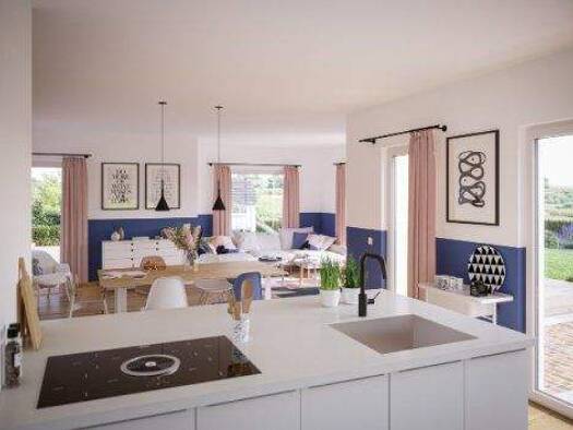 Modernes Satteldachhaus mit exklusivem Wohnkomfort auf über 146 m² Wohnfläche. Großzügige Glasfronten zur Gartenseite sorgen für lichtdurchflutete Räume und ein elegantes Wohngefühl. Der offene Wohn-...
