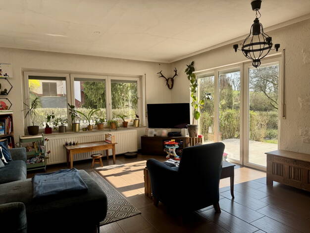 . modernisierter Bungalow in Ortsrandlage mit herrlichem Garten . ca. 180 m² Wohnfläche: großer Wohn-Ess-Bereich mit offener Küche, 2 Schlafzimmer und Bad im Erdgeschoss, zusätzlich 2 Wohnräume + Dus...