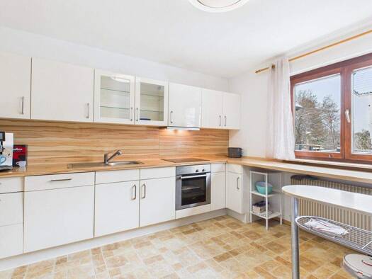Bereits der Eingangsbereich vermittelt ein angenehmes Raumgefühl: hell, einladend und mit direktem Übergang in den Wohnbereich. Das Wohnzimmer öffnet sich über breite Fensterflächen zur Landschaft hi...