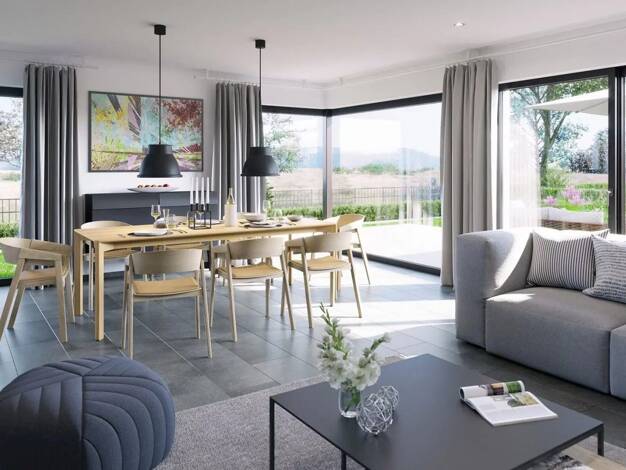 "CELEBRATION 114 V2 Variante " als zAf (zur Ausstattung fertig) inkl. Sanitär-Objekte, Fliesen in den Bädern, inkl. Innentüren das Haus ist inkl. Bodenplatte EG: schönes Wohn-/ Esszimmer, Küche, Diel...