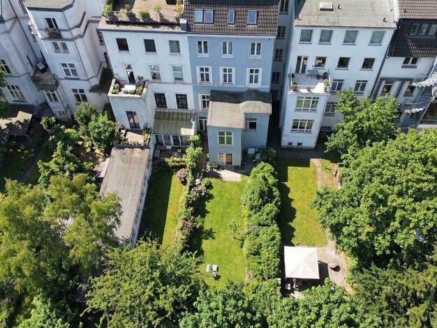 Die großzügige Stadtvilla nahe der Außenalster ist aufgeteilt in drei Parteien und überzeugt mit einer lichtdurchflutenden Raumaufteilung sowie zwei geschmackvoll angelegten Gärten.